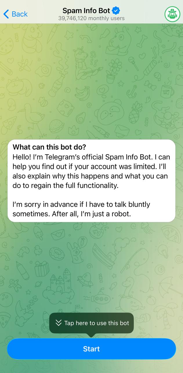 Step 2: Tap Start, wait briefly, and check whether the bot returns a clear restriction message explaining your account’s spam-related limitations.