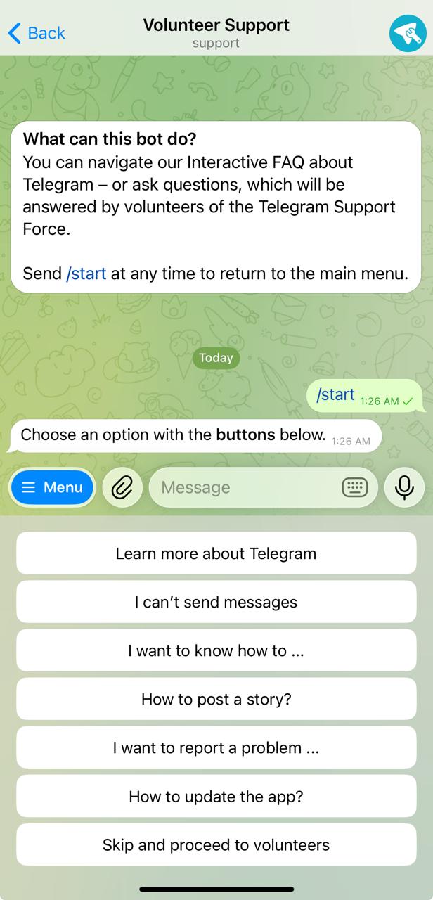 Step 2: Tap Ask a Volunteer when prompted, allowing Telegram to direct you toward human help instead of automated instructions only.