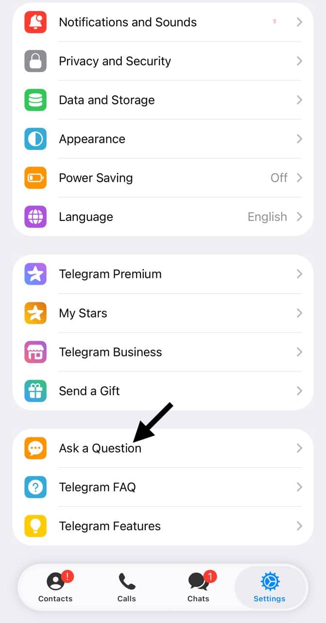 Step 1: Open Telegram’s menu, select Settings, scroll downward, and find the Ask a Question support option for assistance.
