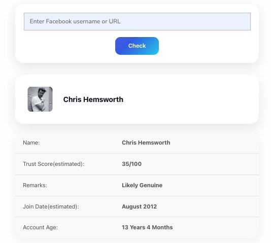 The tool does not directly label an account as fake, but it helps identify risk indicators. Newly created accounts with very low age and trust scores are more commonly linked to scams, spam, or impersonation. Older accounts with consistent activity usually appear more trustworthy. By showing account age and a trust score, the tool helps users make informed judgments. It should be used as a risk assessment aid, not as absolute proof.