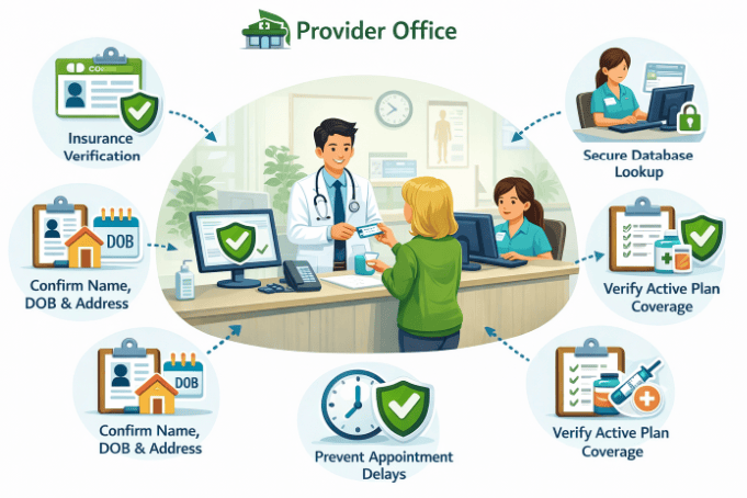 If you are scheduled for a doctor’s visit and do not have your member ID on hand, many provider offices can help you find your coverage details on the spot. When you arrive, the office staff often have tools that verify insurance coverage using your name, date of birth, and sometimes your address.