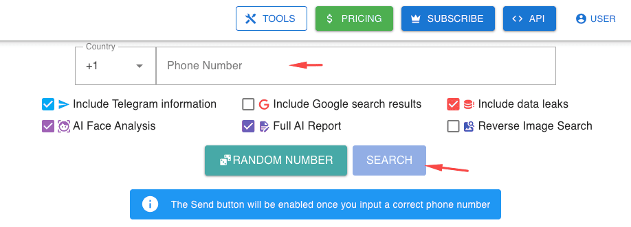 Step 2: Enter the WhatsApp phone number, including +1, and click the search button.