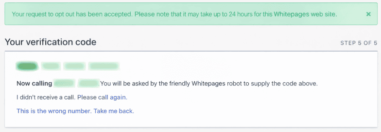 Whitepages typically verifies opt-out requests through an automated phone call. You will be asked to provide a phone number where you can receive the verification code or call. The system will either call you with a confirmation message or provide a code that you need to enter on the website. This process ensures that the removal request is genuine. The phone number used for verification is not added to your listing and is only used for confirmation. Once the verification is completed, your request will move to the processing stage.