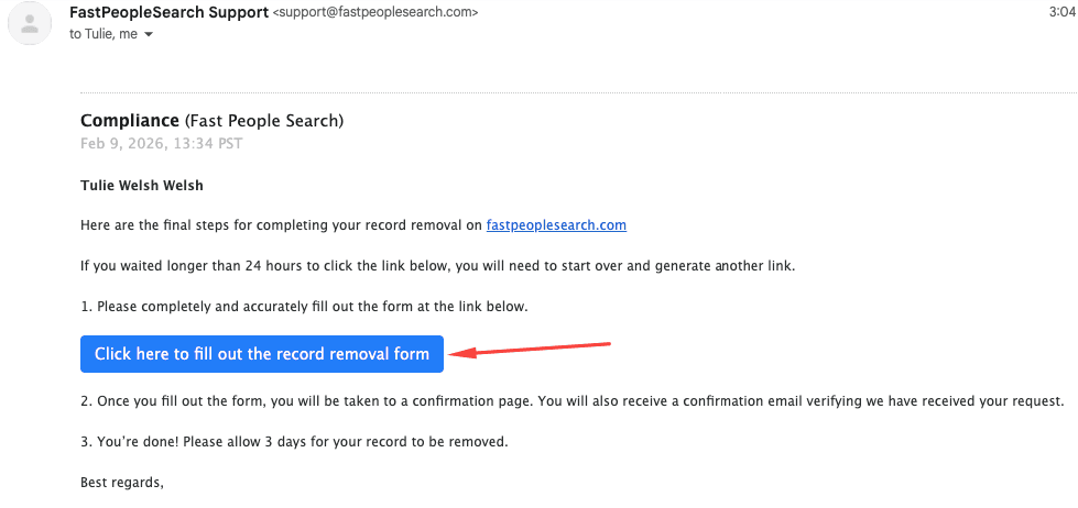 Open your email inbox and look for the message from FastPeopleSearch. Click the verification link included in the email to continue the process. The link will take you to a form where you need to provide the profile details you found earlier on the website.