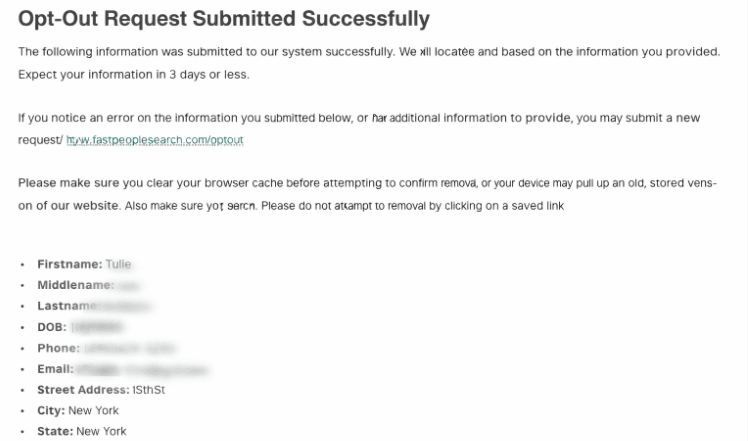 After submitting the final form, you will see a confirmation message stating that your record will be removed within approximately 3 days. In many cases, the listing disappears within a few hours, but it may take up to several days depending on processing time. If you had multiple profiles earlier, repeat the same process for each listing. Once removed, check the website again after a few days to make sure your information no longer appears, and your privacy is fully protected.