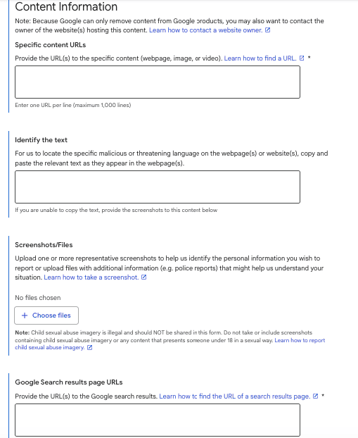 Step 3: Include exact page URLs, screenshots, and details about which content should be removed to help administrators process requests faster and more accurately.