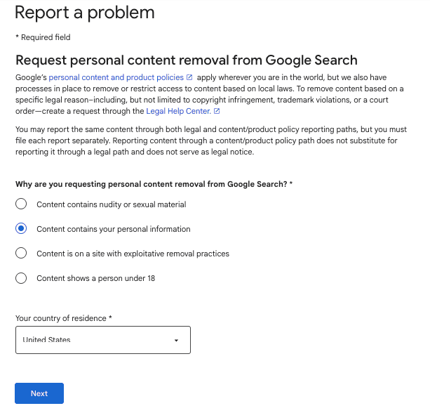 2. Submit Google Personal Information Removal Form