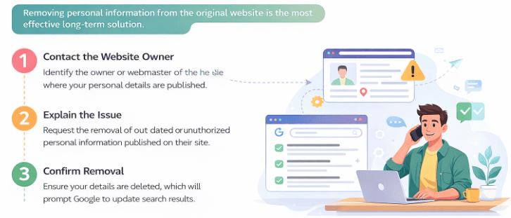 Removing personal information from the original website is the most effective long-term solution. Once deleted from the source, Google updates search results automatically. This method works best for directories, blogs, or data broker sites where your personal details are published without your permission or are unnecessarily outdated.