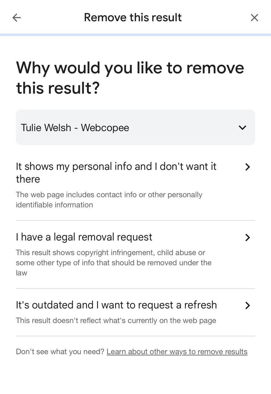 Step 3: From the information panel, select the ‘Remove result’ option to begin submitting a privacy removal request directly through Google.