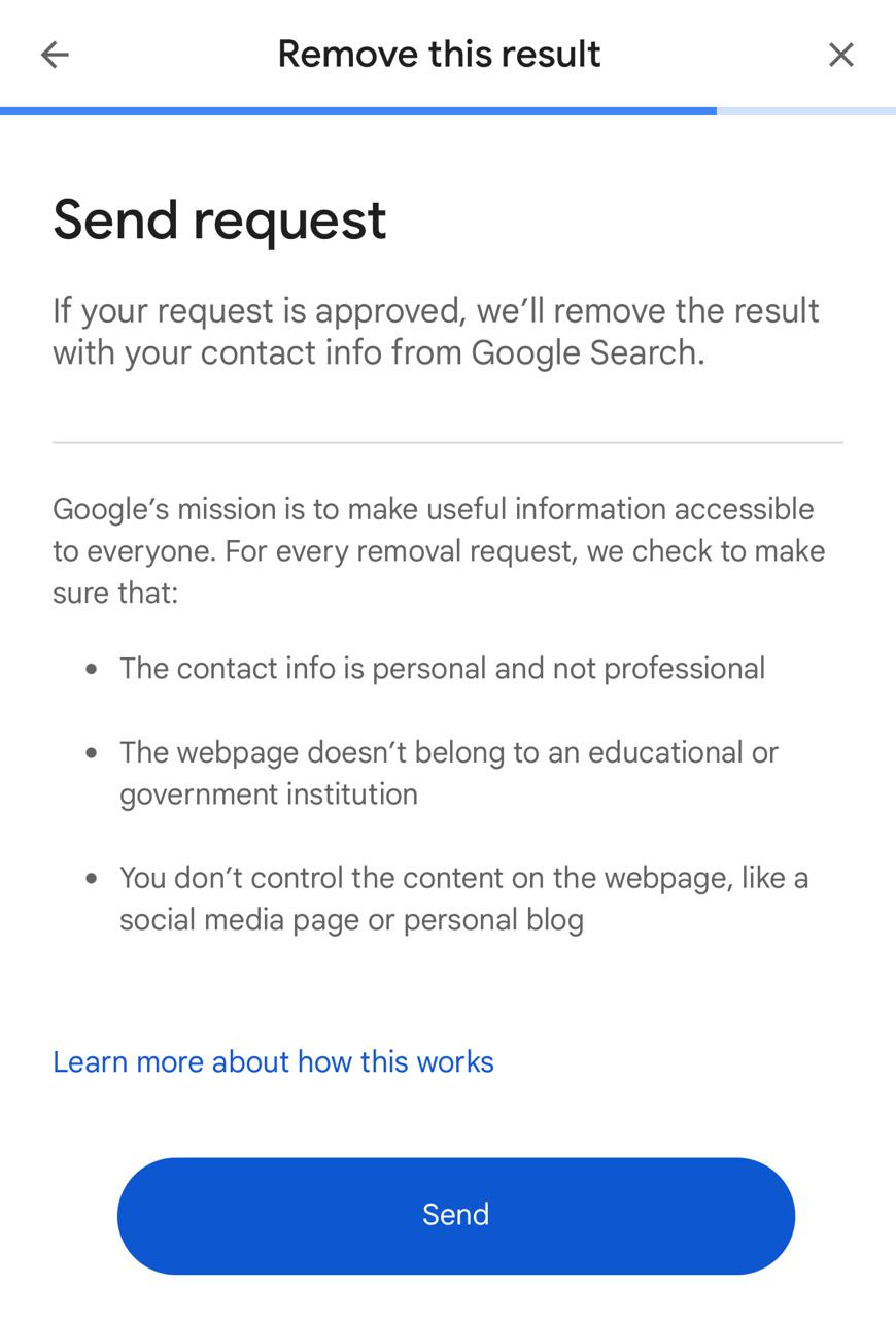 Google allows users to request the removal of personal information directly from search results. This method is best when sensitive details like phone numbers, addresses, or emails appear publicly.