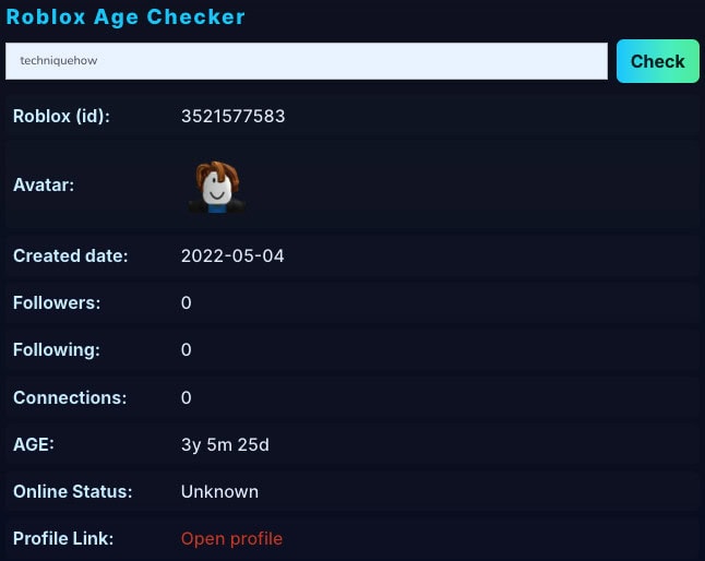 There is a tool that tracks the Roblox user data (followers, connections, and join date estimates) and presents them in an easy interface. The tool allows you to enter the Roblox username and see the account age, number of followers, number of following, number of connections, etc. This method is convenient because you don’t have to dig through the profile manually.