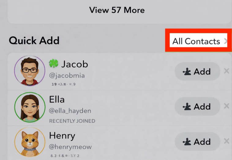 If the person has linked their phone number to their Snapchat account and allowed discoverability, you can find them by syncing your contacts. Once you allow Snapchat access to your phone contacts, the app scans your list and shows users who are already on Snapchat. This method works best for friends, family members, or colleagues whose numbers are saved. After they appear in the contacts section, you can simply tap Add to send them a friend request.