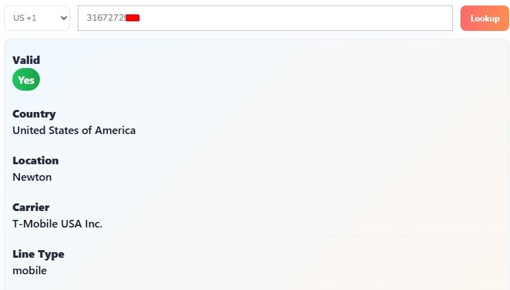 Just enter the number and click “Lookup.” Within seconds, the system fetches verified information such as the carrier name, the caller’s location, country, and type of line (mobile, landline, or VoIP).