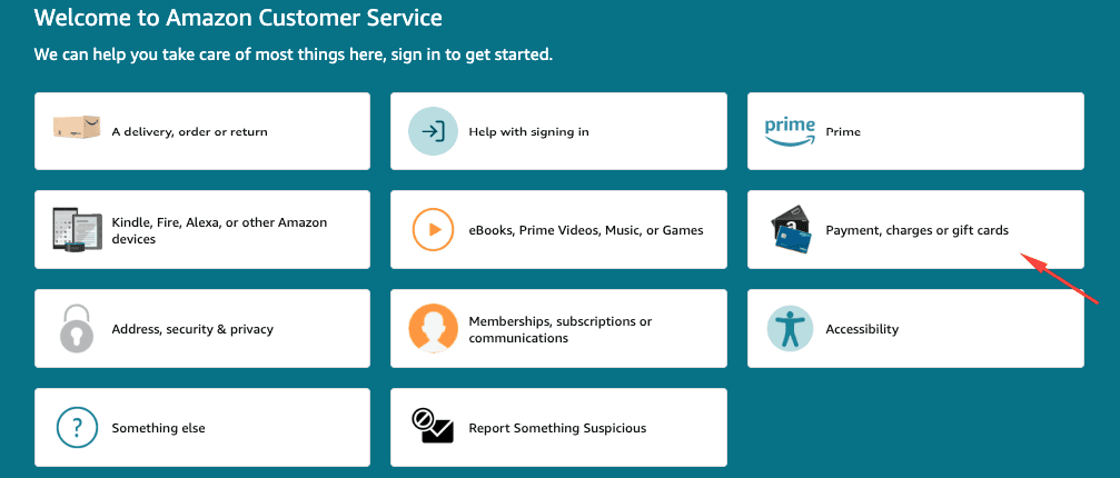 Step 2: Now, click Payments, Charges, Invoices & Gift Cards. From the options, select Gift Cards or Problem with a Gift Card.