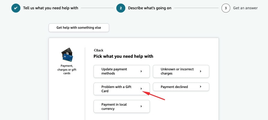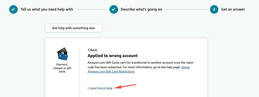 Step 3: Choose Applied to the wrong account as your gift card problem. This option tells Amazon that the balance was added incorrectly.